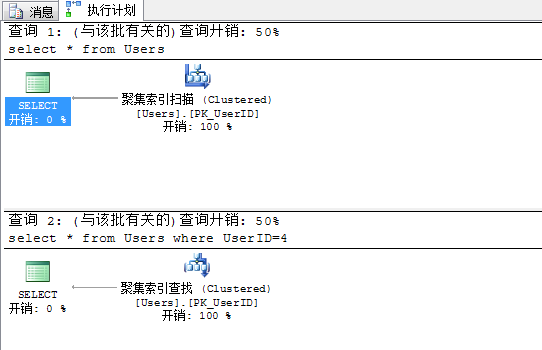 2.執(zhí)行以下查詢并查看查詢計(jì)劃,可以看到第一個(gè)SQL執(zhí)行聚集索引掃描,第二個(gè)SQL執(zhí)行聚集索引查找都沒有使用到書簽查找