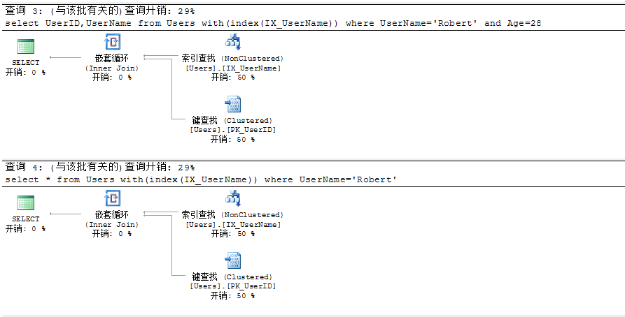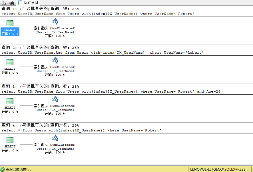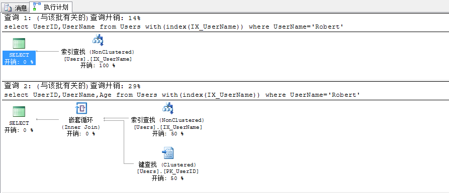 select UserID,UserName from Users with(index(IX_UserName)) where UserName='Robert' --查詢2:使用索引IX_UserName,選擇列UserID,UserName,Age,查詢條件列為UserName