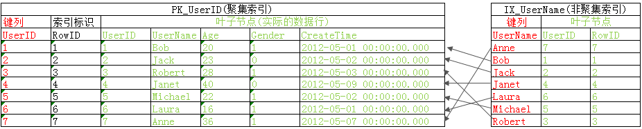 和許多人一樣看到大神們畫的二叉樹索引結(jié)構(gòu)圖就腦袋大,看得云里霧里,所以這里我們以表Users為例來說聚集索引(PK_UserID)和非聚集索引(IX_UserName)的結(jié)構(gòu)可以簡單的表示為下圖