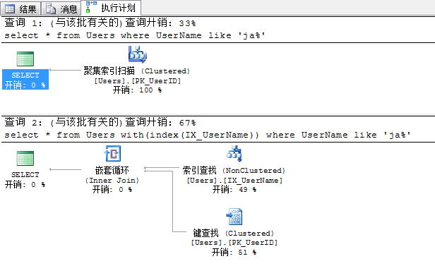 --set statistics io onselect * from Users where UserName like 'ja%'select * from Users with(index(IX_UserName)) where UserName like 'ja%'