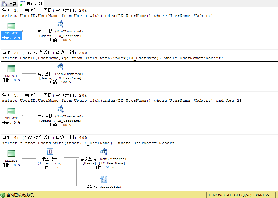 select UserID,UserName,Age from Users with(index(IX_UserName)) where UserName='Robert' --查詢3:使用索引IX_UserName,選擇列UserID,UserName,查詢條件列為UserName,Age