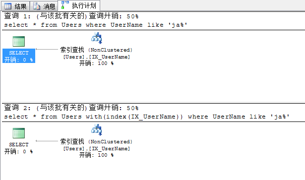 select * from Users where UserName like 'ja%'select * from Users with(index(IX_UserName)) where UserName like 'ja%'