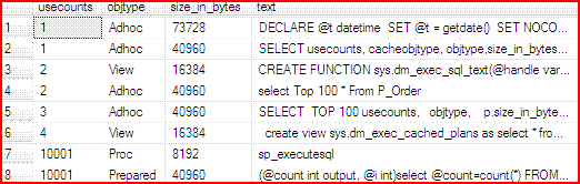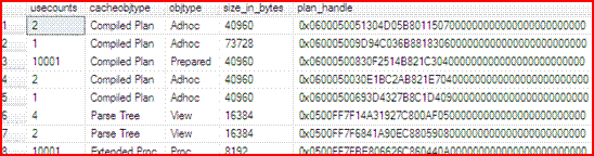 SELECT usecounts, cacheobjtype, objtype,size_in_bytes, plan_handle