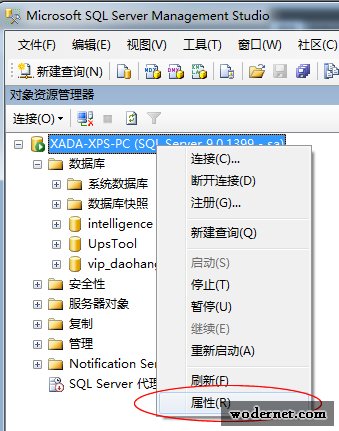2、確保服務(wù)器端的數(shù)據(jù)庫允許遠(yuǎn)程連接,登錄SQL2005企業(yè)管理器后,右鍵本機(jī)數(shù)據(jù)庫點(diǎn)擊“屬性”,