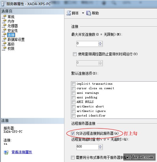 在彈出的“服務(wù)器屬性”對話框中選中“連接”,勾選“允許遠(yuǎn)程連接到此服務(wù)器(A)”