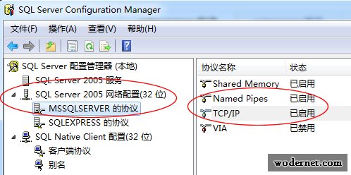 3、打開SQL服務(wù)器的TCP/IP是允許的,在開始菜單中找到Microsoft SQL Server 2005——配置工具——SQL Server Configuration Manager,在該窗口中把SQL Server 2005網(wǎng)絡(luò)配置下面的MSSQLSERVER的協(xié)議下面的TCP/IP和Named Pipes都啟用。