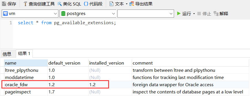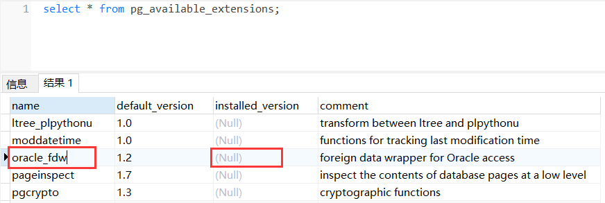 拷貝之后,通過sql語句可以查詢到oracle_fdw,說明文件拷貝放置成功,但是尚未安裝(isstalled_version為空)。
