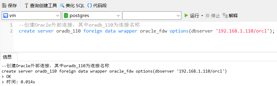--創(chuàng)建Oracle外部連接,其中oradb_110為連接名稱 create server oradb_110 foreign data wrapper oracle_fdw options(dbserver '192.168.1.110/orcl');