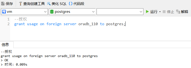 --授權 grant usage on foreign server oradb_110 to postgres;