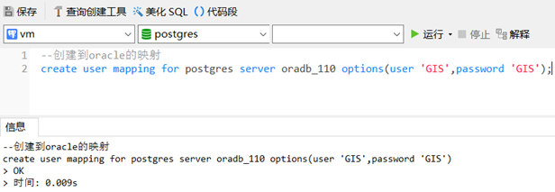 --創(chuàng)建到oracle的映射 create user mapping for postgres server oradb_110 options(user 'GIS',password 'GIS');