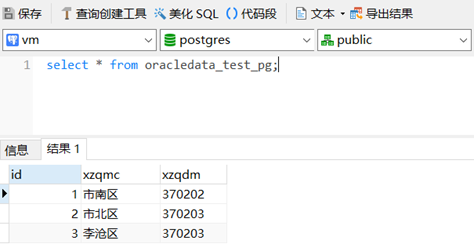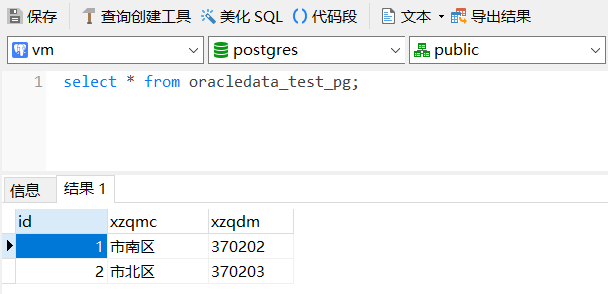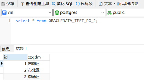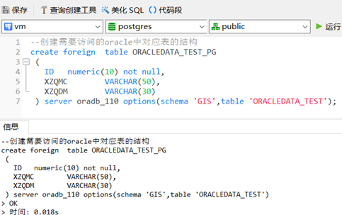 --創(chuàng)建需要訪問的oracle中對應表的結(jié)構 create foreign table ORACLEDATA_TEST_PG_2 ( ID numeric(10) not null, XZQDM VARCHAR(30) ) server oradb_110 options(schema 'GIS',table 'ORACLEDATA_TEST');