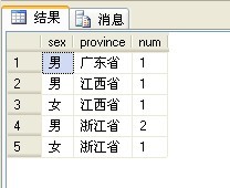 4.select sex ,province, count (province)as num from student group by sex,province (查詢各省男女?dāng)?shù)量)
