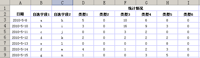 select to_date(to_char(日期,'yyyy-MM-dd'),'yyyy-mm-dd') 日期,自選字段1,自選字段2,0 類型1,0 類型2,0 類型3,0 類型4,0 類型5,count(主鍵字段) 類型6 from 表名