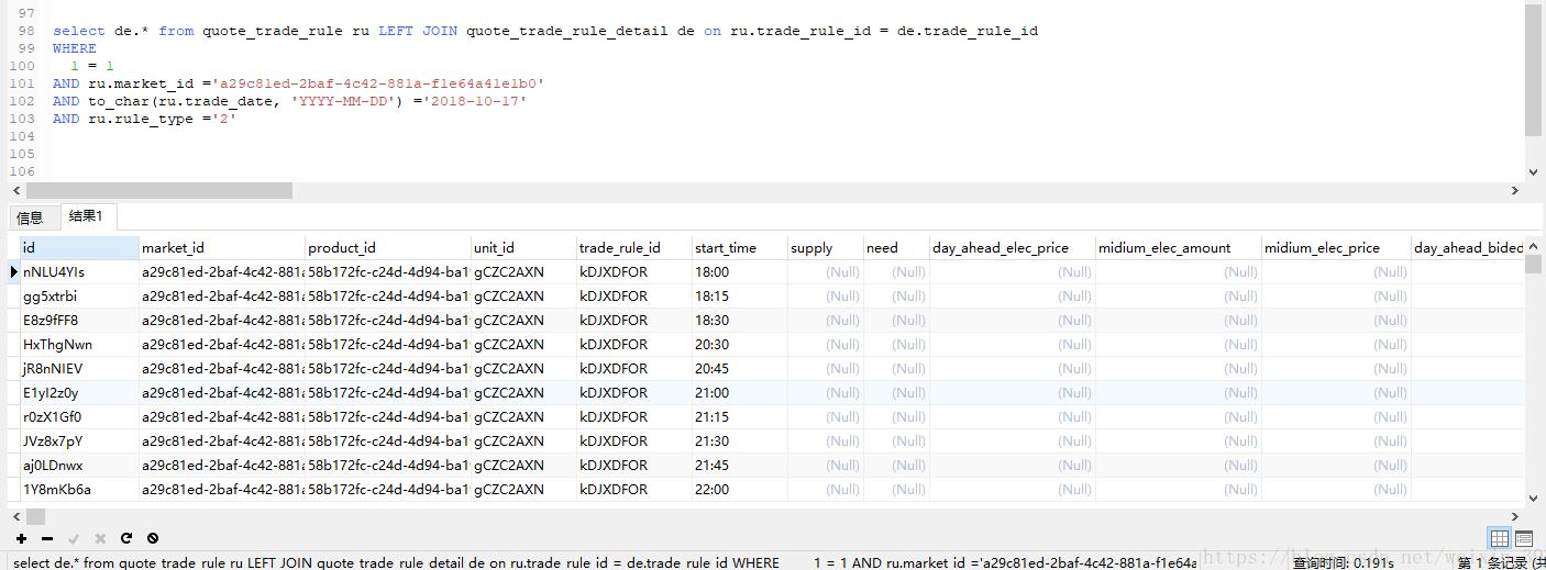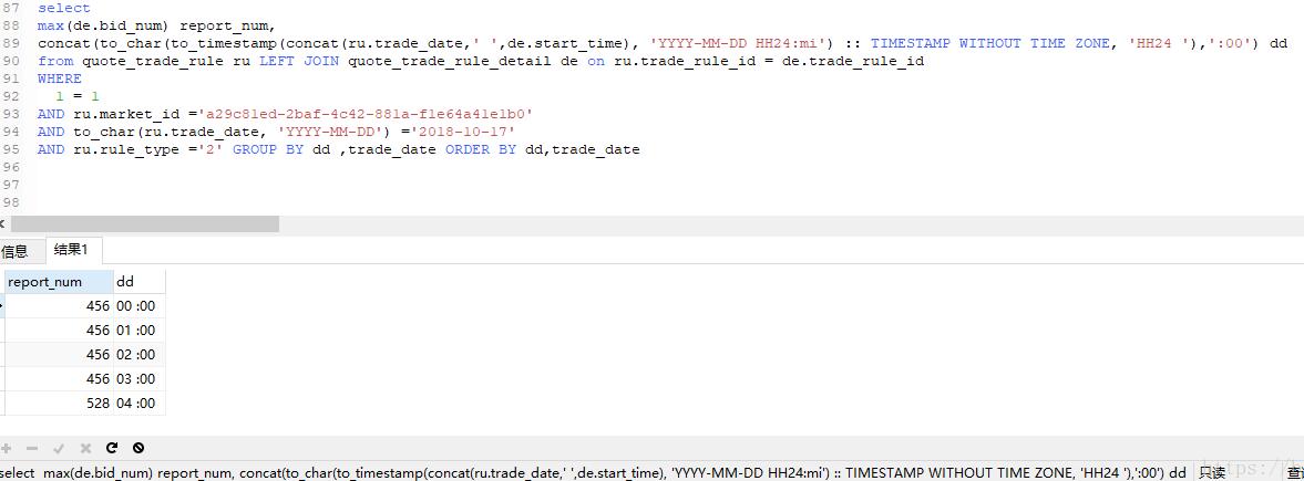sql:select max(de.bid_num) report_num,concat(to_char(to_timestamp(concat(ru.trade_date,' ',de.start_time), 'YYYY-MM-DD HH24:mi') :: TIMESTAMP WITHOUT TIME ZONE, 'HH24 '),':00') dd from quote_trade_rule ru LEFT JOIN quote_trade_rule_detail de on ru.trade_rule_id = de.trade_rule_id WHERE 1 = 1 AND ru.market_id ='a29c81ed-2baf-4c42-881a-f1e64a41e1b0' AND to_char(ru.trade_date, 'YYYY-MM-DD') ='2018-10-17' AND ru.rule_type ='2' GROUP BY dd ,trade_date ORDER BY dd,trade_date