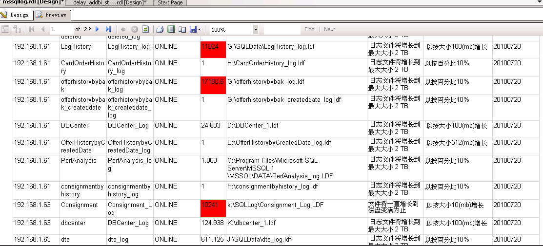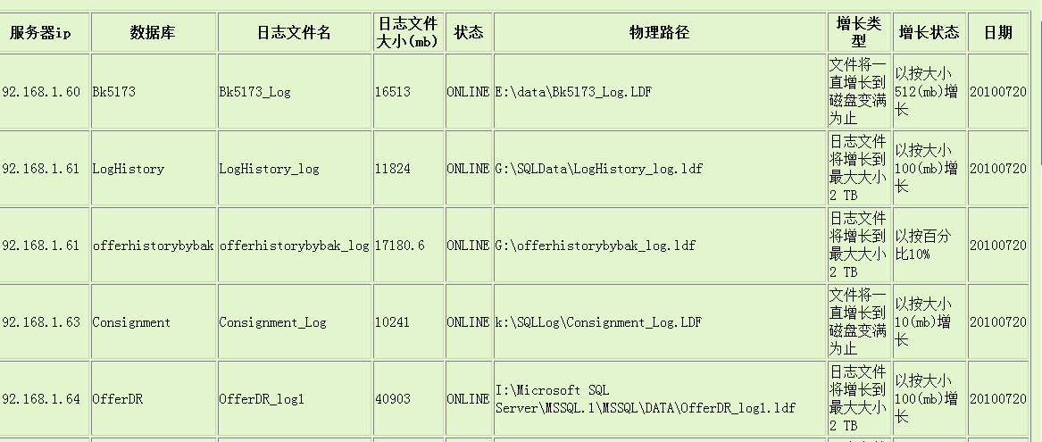 <tr><th>服務(wù)器ip</th><th>數(shù)據(jù)庫</th><th>日志文件名</th><th>日志文件大小(mb)</th><th>狀態(tài)</th><th>物理路徑</th><th>增長類型</th><th>增長狀態(tài)</th><th>日期</th>'