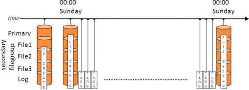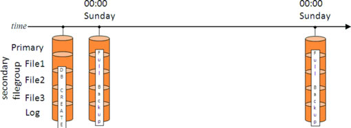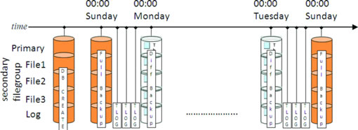 在全備份之間加入日志備份,可以把備份時(shí)間點(diǎn)縮小到更小的粒度.可以在每天做一個(gè)全備份,每一個(gè)小時(shí)或者半個(gè)小時(shí)做一次日志備份.這樣子的話,如果在23:59分發(fā)生故障,需要restore一個(gè)full backup+23個(gè)transaction log backup,操作恢復(fù)的時(shí)間會(huì)比較久.
