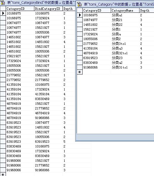 每個(gè)分類在tomi_CategoryBind有完整的目錄結(jié)構(gòu)。。一個(gè)分類在tomi_CategoryBind的記錄數(shù)等于他在tomi_Category的depth值。 圖片: