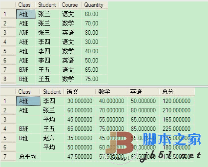 insert into @tab(Class,Student,Course,Quantity) values('A班','李四','英語',50); insert into @tab(Class,Student,Course,Quantity) values('B班','王五','語文',65);