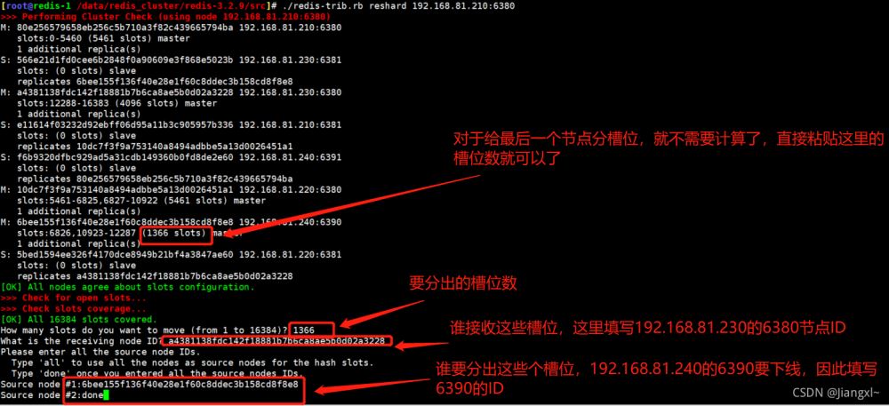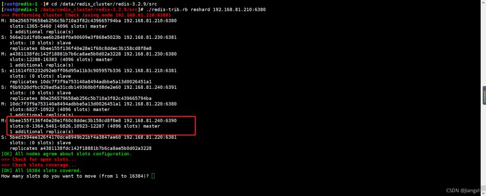 只需要把What is the receiving node ID填寫(xiě)成192.168.81.210的6380節(jié)點(diǎn)ID即可,指的是分配出來(lái)的槽位要給誰(shuí)。