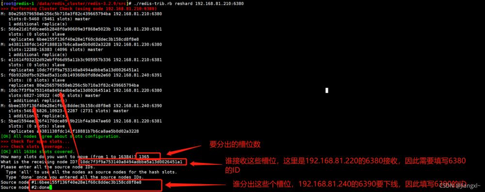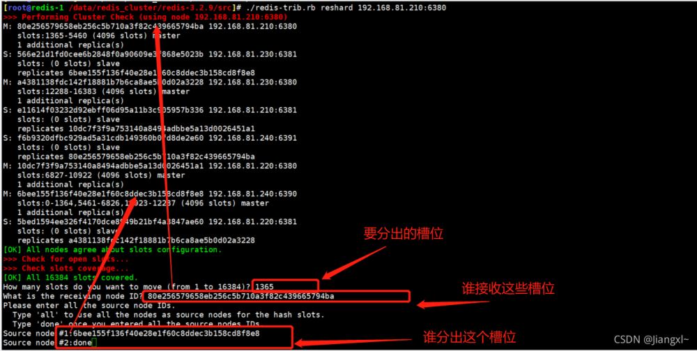 ? 2.有幾個(gè)主節(jié)點(diǎn)就需要執(zhí)行幾次reshard命令,首先填寫(xiě)要分出的槽位數(shù),然后填寫(xiě)分給誰(shuí),最后填寫(xiě)從哪里分。