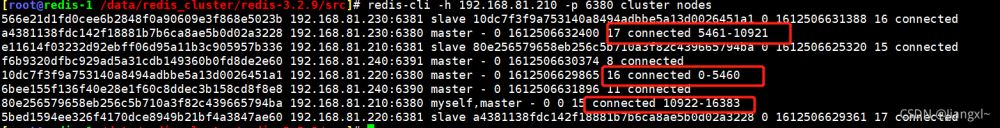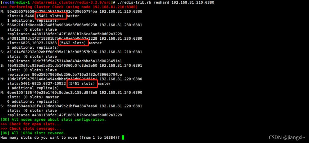 可以非常清楚的看到,現(xiàn)在每個(gè)主節(jié)點(diǎn)的槽位數(shù)為5461。