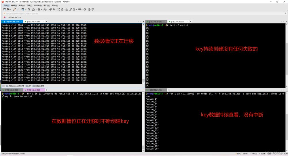 多開(kāi)幾個(gè)窗口,一個(gè)執(zhí)行數(shù)據(jù)槽位遷移,一個(gè)不斷創(chuàng)建key,一個(gè)查看key的創(chuàng)建進(jìn)度,一個(gè)查看key的數(shù)據(jù)。