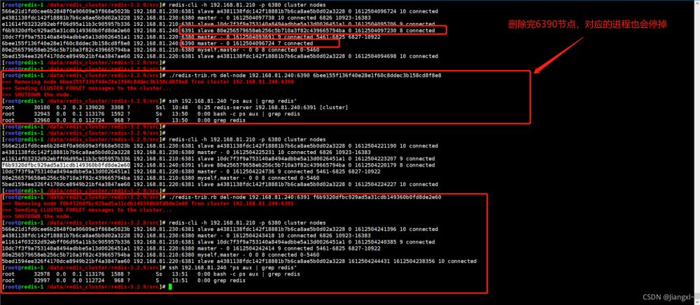 [root@redis-1 /data/redis_cluster/redis-3.2.9/src]# ./redis-trib.rb del-node 192.168.81.240:6390 6bee155f136f40e28e1f60c8ddec3b158cd8f8e8 >>> Removing node 6bee155f136f40e28e1f60c8ddec3b158cd8f8e8 from cluster 192.168.81.240:6390 >>> Sending CLUSTER FORGET messages to the cluster... >>> SHUTDOWN the node. [root@redis-1 /data/redis_cluster/redis-3.2.9/src]# ./redis-trib.rb del-node 192.168.81.240:6391 f6b9320dfbc929ad5a31cdb149360b0fd8de2e60 >>> Removing node f6b9320dfbc929ad5a31cdb149360b0fd8de2e60 from cluster 192.168.81.240:6391 >>> Sending CLUSTER FORGET messages to the cluster... >>> SHUTDOWN the node.