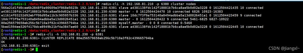 [root@redis-1 ~]# redis-cli -h 192.168.81.230 -p 6381 192.168.81.230:6381> CLUSTER REPLICATE 80e256579658eb256c5b710a3f82c439665794ba OK