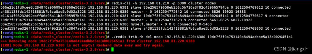 [root@redis-1 /data/redis_cluster/redis-3.2.9/src]# ./redis-trib.rb del-node 192.168.81.220:6380 10dc7f3f9a753140a8494adbbe5a13d0026451a1 >>> Removing node 10dc7f3f9a753140a8494adbbe5a13d0026451a1 from cluster 192.168.81.220:6380 [ERR] Node 192.168.81.220:6380 is not empty! Reshard data away and try again.