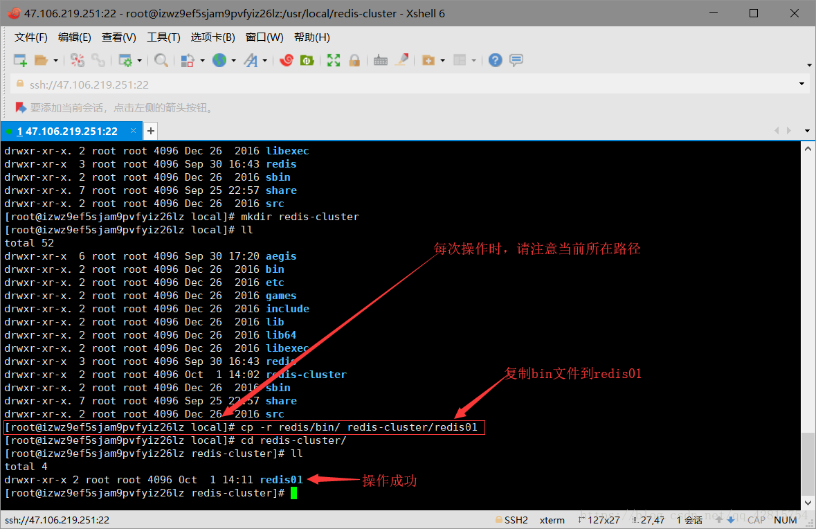 3.2 把redis目錄下的bin目錄下的所有文件復(fù)制到/usr/local/redis-cluster/redis01目錄下,不用擔(dān)心這里沒(méi)有redis01目錄,會(huì)自動(dòng)創(chuàng)建的。操作命令如下(注意當(dāng)前所在路徑):