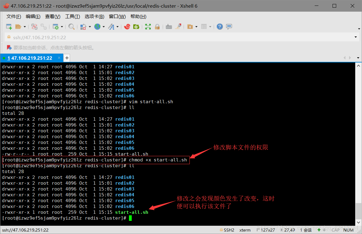 3.5 接著啟動(dòng)所有redis節(jié)點(diǎn),由于一個(gè)一個(gè)啟動(dòng)太麻煩了,所以在這里創(chuàng)建一個(gè)批量啟動(dòng)redis節(jié)點(diǎn)的腳本文件,命令為start-all.sh,文件內(nèi)容如下:
