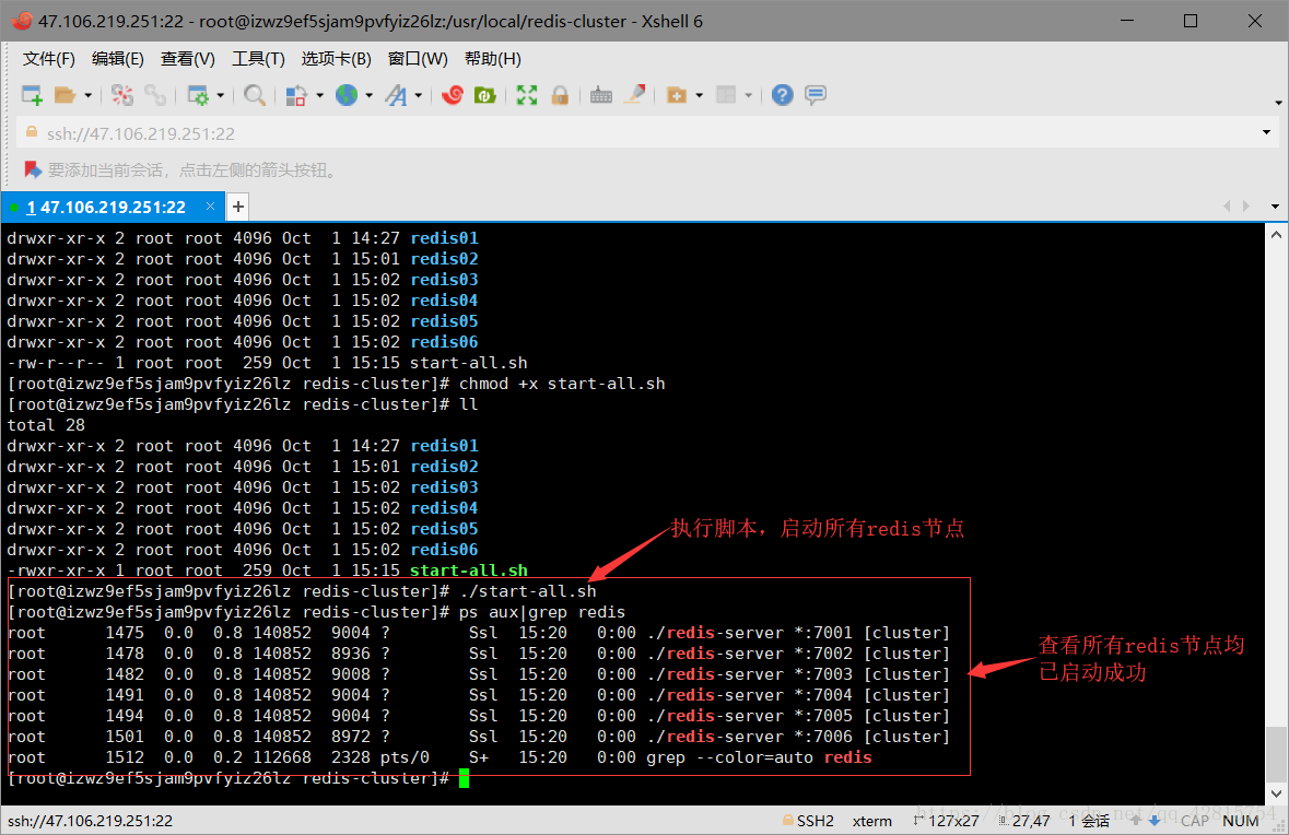 3.7 執(zhí)行start-all.sh腳本,啟動(dòng)6個(gè)redis節(jié)點(diǎn)