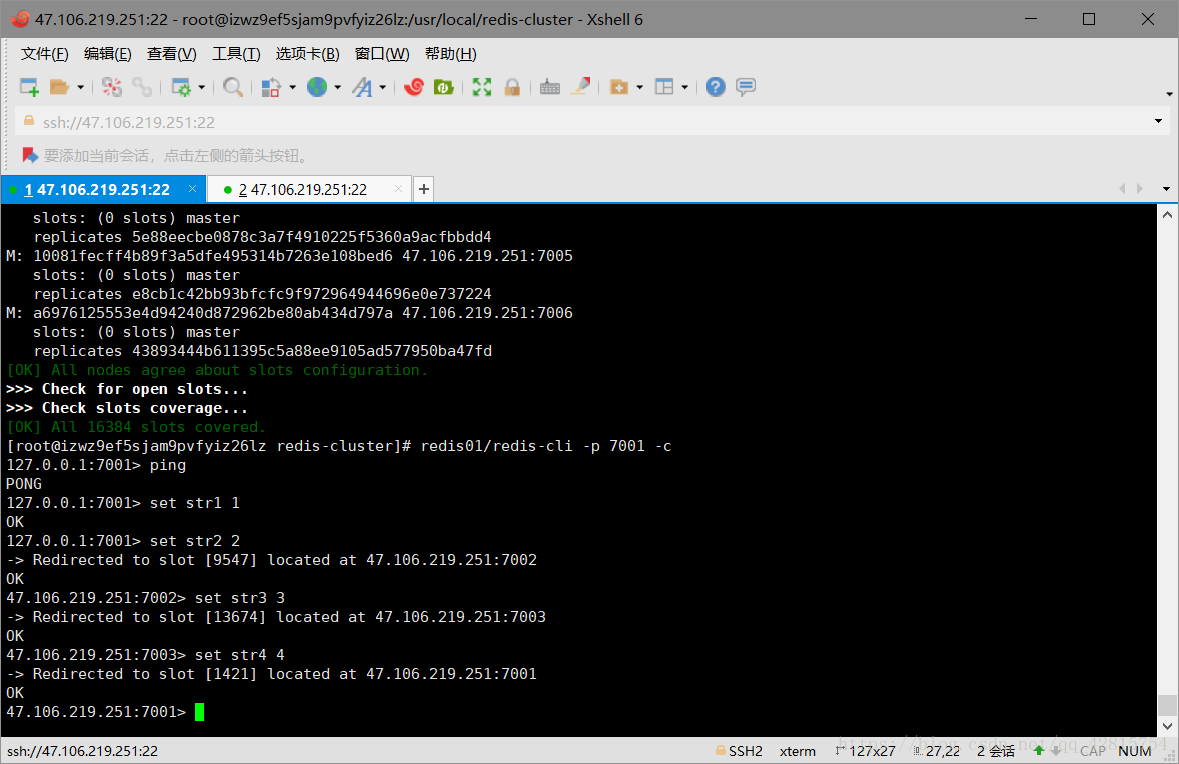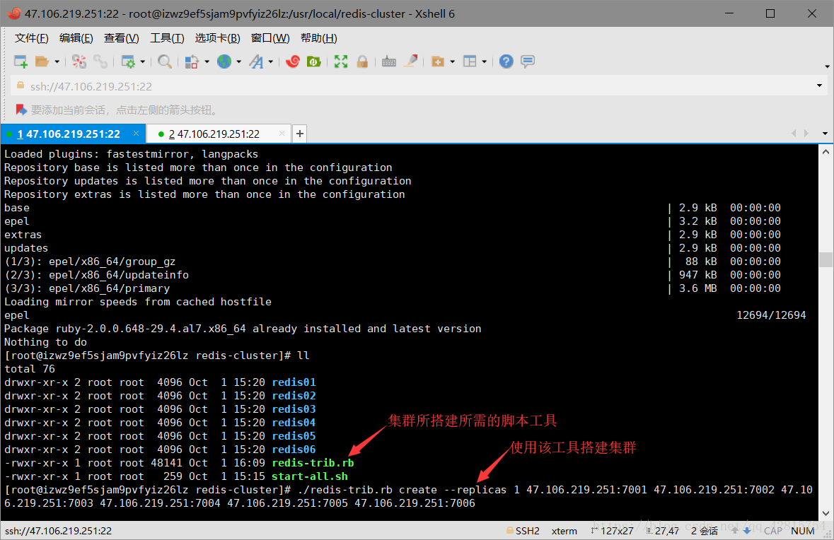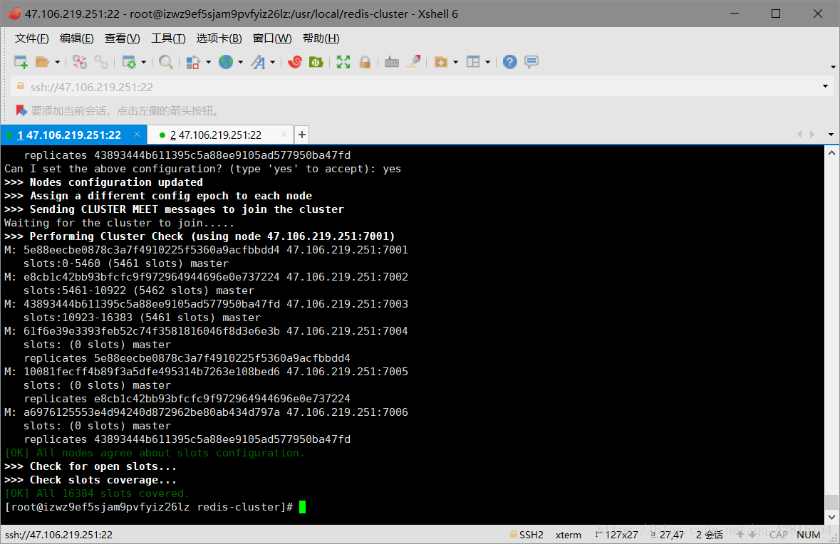 ./redis-trib.rb create --replicas 1 47.106.219.251:7001 47.106.219.251:7002 47.106.219.251:7003 47.106.219.251:7004 47.106.219.251:7005 47.106.219.251:700