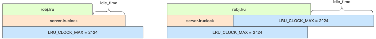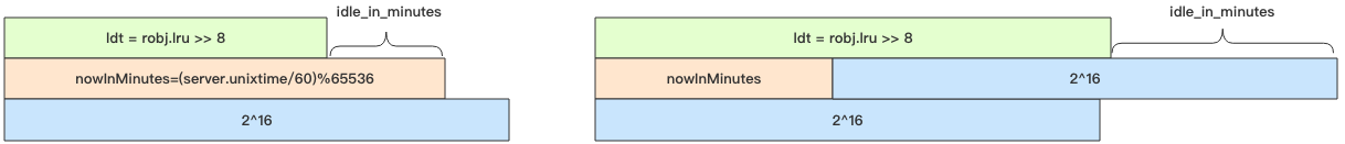 ldt 是 16 個(gè)位,用來存儲(chǔ)上一次 logc 的更新時(shí)間(精度不可能很高),它取的是分鐘時(shí)間戳對 2^16 進(jìn)行取模,大約每隔 45 天就會(huì)折返。同 LRU 模式一樣,我們也可以使用這個(gè)邏輯計(jì)算出對象的空閑時(shí)間,只不過精度是分鐘級別的。