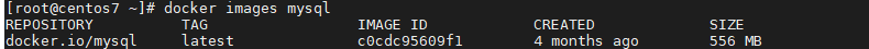 開啟一個命令窗口,在其中運行docker pull mysql:latest,下載最新的mysql鏡像。下載完成后,通過docker images mysql能看到如下圖所示的鏡像i信息。