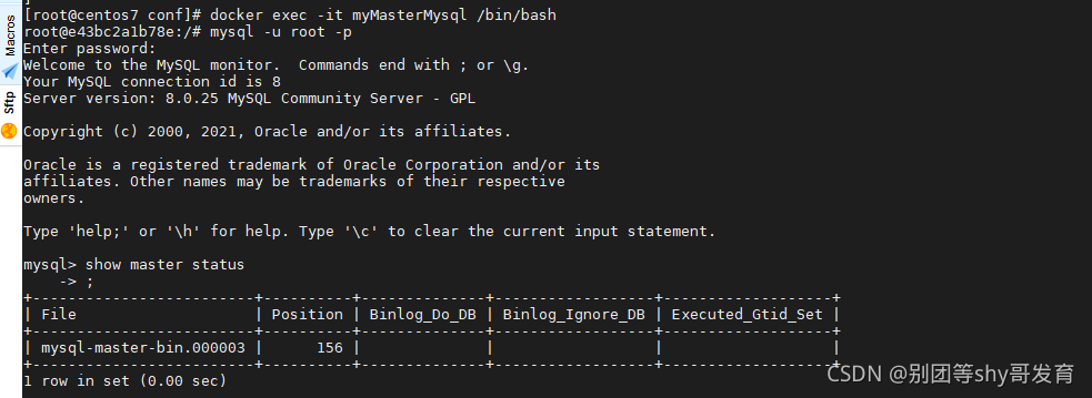 運行docker exec -it myMasterMysql /bin/bash命令后進入該myMasterMysql容器的命令行窗口,再運行mysql -u root -p命令,進入MYSQL服務(wù)器的命令行窗口,在這個Mysql命令里,以-u參數(shù)指定用戶名,隨后需要輸入密碼(剛才設(shè)置的123456).
