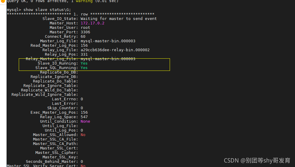 本命令運行在mySlaveMysql容器中的從Mysql服務(wù)器里,通過master_host和master_port指定主服務(wù)器的ip地址和端口號,通過master_user和master_password設(shè)置了連接所用的用戶名和密碼。