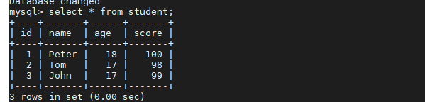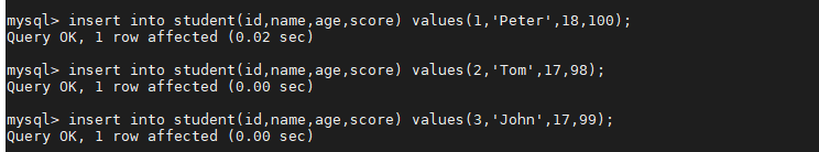 insert into student(id,name,age,score) values(1,'Peter',18,100); insert into student(id,name,age,score) values(2,'Tom',17,98); insert into student(id,name,age,score) values(3,'John',17,99);