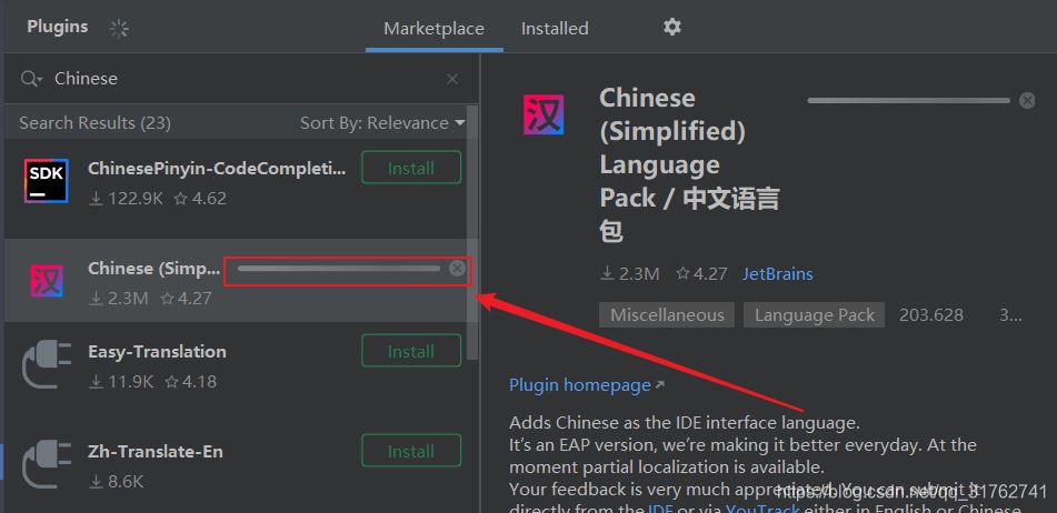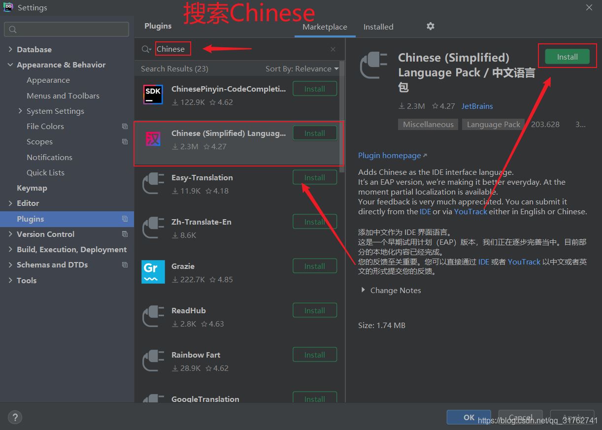 搜索Chinese,選擇第二個(gè)中文語言包,點(diǎn)擊install