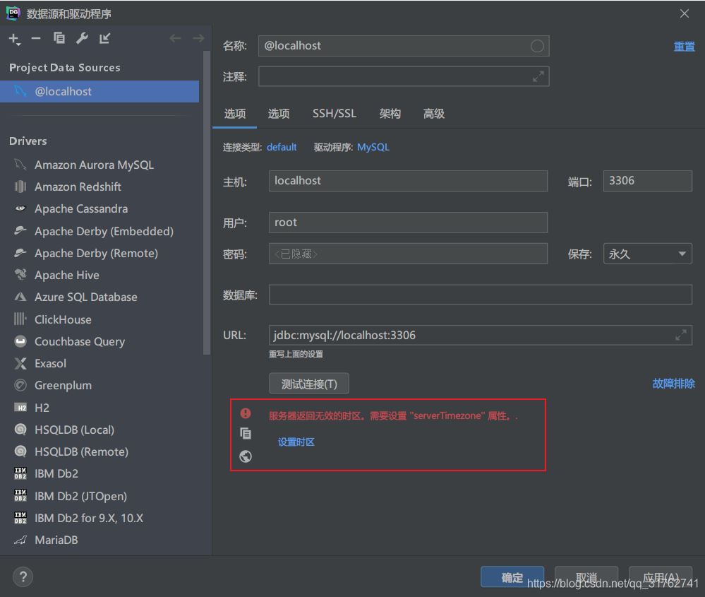 點(diǎn)擊測(cè)試連接/Test Connection后報(bào)錯(cuò):服務(wù)器返回?zé)o效的時(shí)區(qū),需要設(shè)置"serverTimezone"屬性Server returns invalid timezone. Go to 'Advanced' tab and set 'serverTimezon
