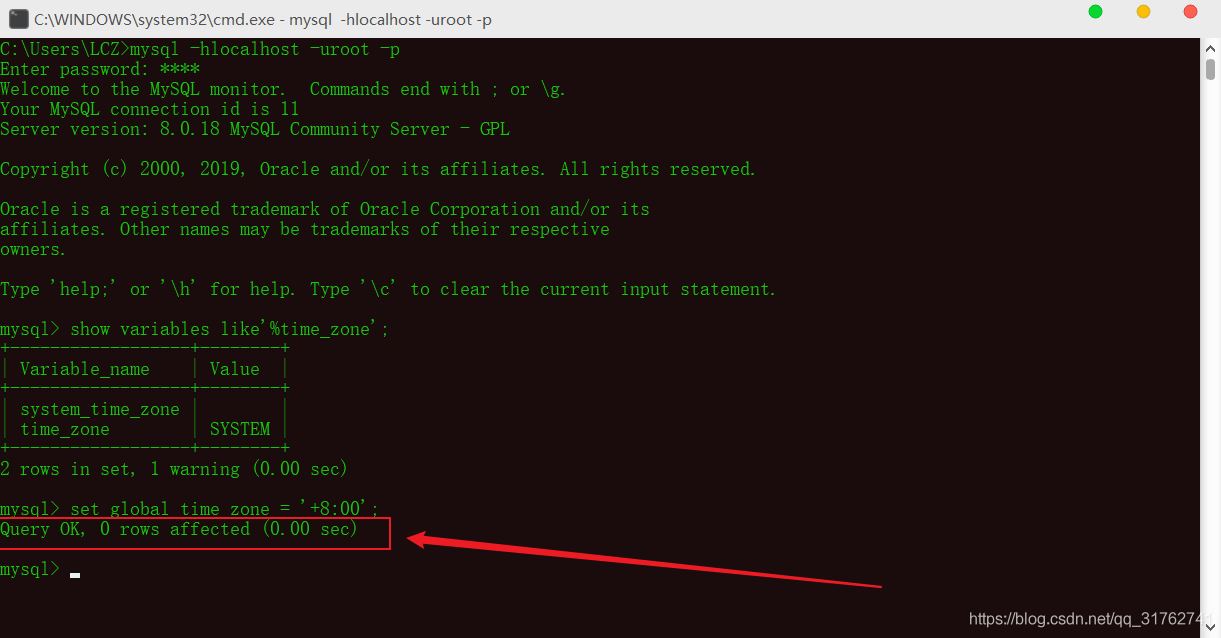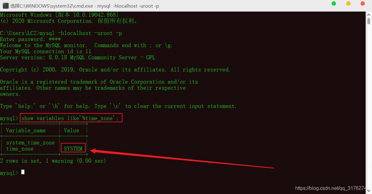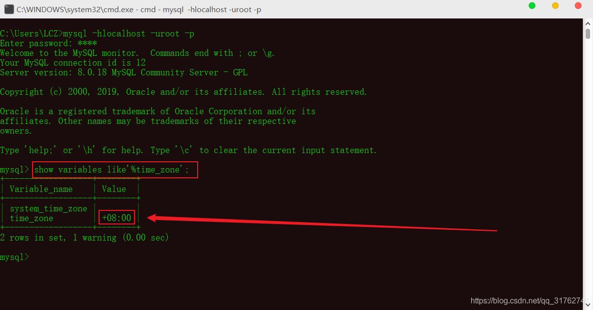然后關(guān)閉cmd重新打開cmd重新連接數(shù)據(jù)庫,連接成功后輸入show variables like'%time_zone'; 回車