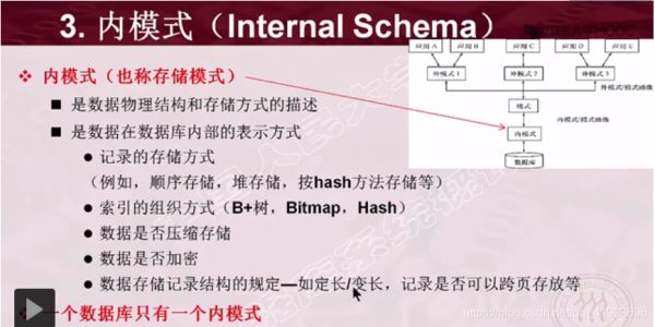 內(nèi)模式也稱為存儲(chǔ)模式,它是數(shù)據(jù)庫(kù)在物理存儲(chǔ)器上具體實(shí)現(xiàn)的描述,是數(shù)據(jù)在數(shù)據(jù)庫(kù)內(nèi)部的表示方法,也是數(shù)據(jù)物理結(jié)構(gòu)和存儲(chǔ)方式的描述。一個(gè)數(shù)據(jù)庫(kù)只有一種內(nèi)模式。