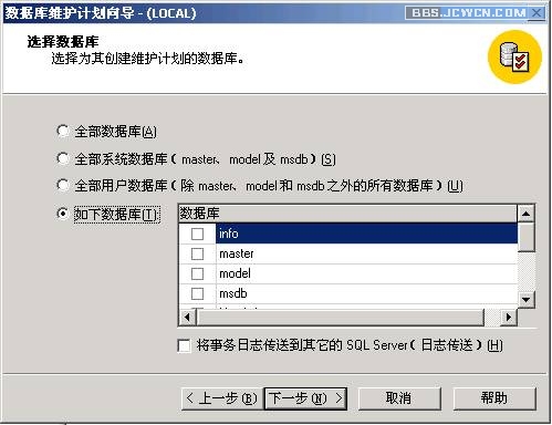 選擇你想要備份的數據庫,下一步。在接下來的一步中,我們默認所有選項,下一步。在當前對話框中可以選擇是否檢查數據庫的完整性,這里我們默認就可以進行下一步就行了。對話框入圖所示: