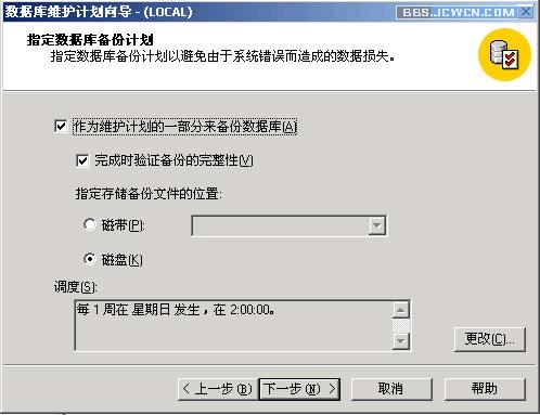 選中作為維護計劃的一部分來備份數據庫,點擊更改按鈕修改備份數據庫的時間,單擊下一步,入下圖: