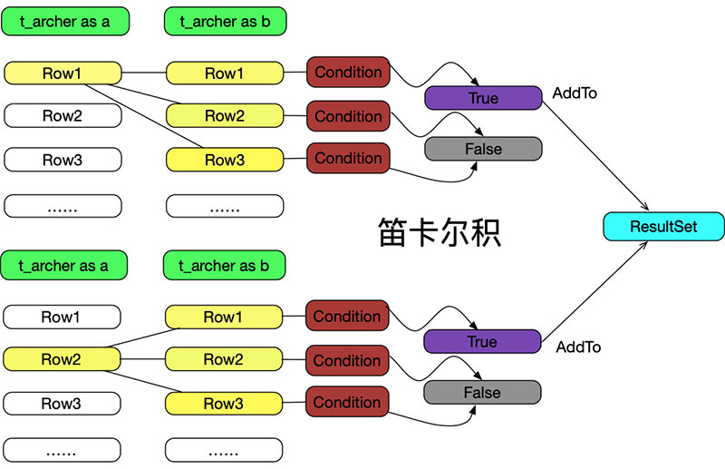 對join最簡單處理方案就是對兩張表進(jìn)行笛卡爾積,然后通過上面的where condition進(jìn)行過濾,如下圖所示: