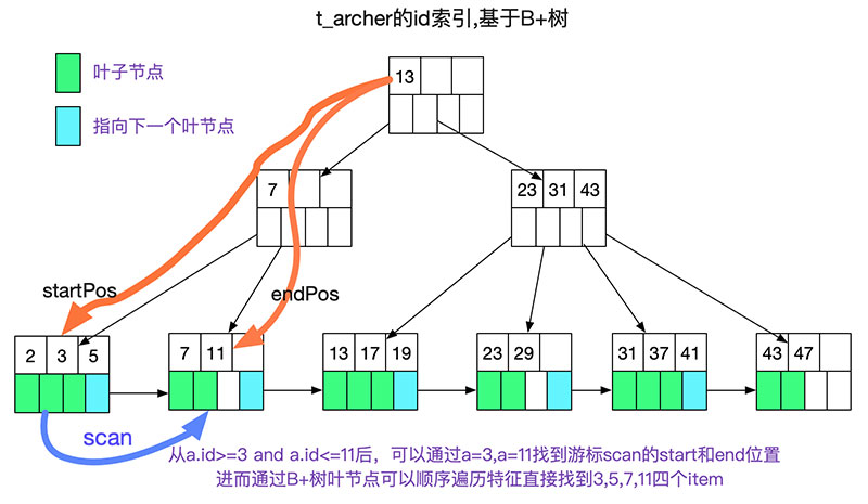 那么就可以界定出在id這個索引上,a的scan范圍為[3,11],如下圖所示: