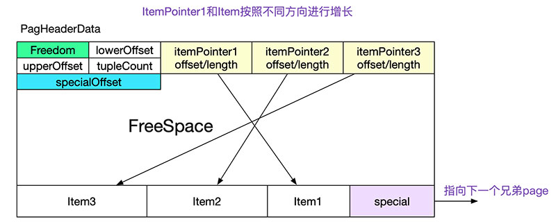 其中ItemPointer里面存儲了對應(yīng)item的起始偏移和長度。同時ItemPointer和Item如圖所示是向著中心方向進(jìn)行伸張,這種結(jié)構(gòu)很有效的組織了非定長Item。