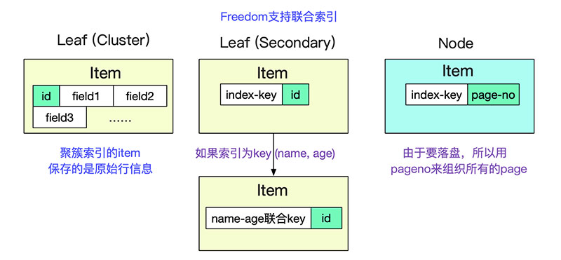 由于要落盤,所以Freedom在node節(jié)點(diǎn)中的item里面寫入了index-key對應(yīng)的pageno,