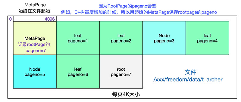 Freedom的B+Tree是存儲到磁盤里的。考慮到存儲的限制以及不定長的key值,所以會變得非常復(fù)雜。Freedom以page為單位來和磁盤進(jìn)行交互。葉子節(jié)點(diǎn)和非葉子節(jié)點(diǎn)都由page承載并刷入磁盤。結(jié)構(gòu)如下所示: