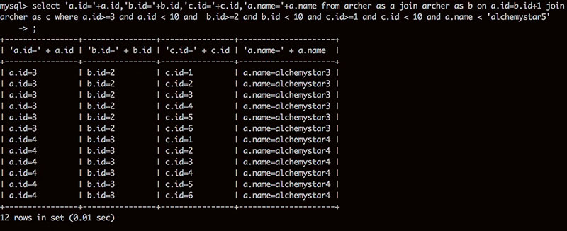 select a.*,b.* from t_archer as a join t_rider as b where a.id>=3 and a.id<=11 and b.id>=19 and b.id<=31